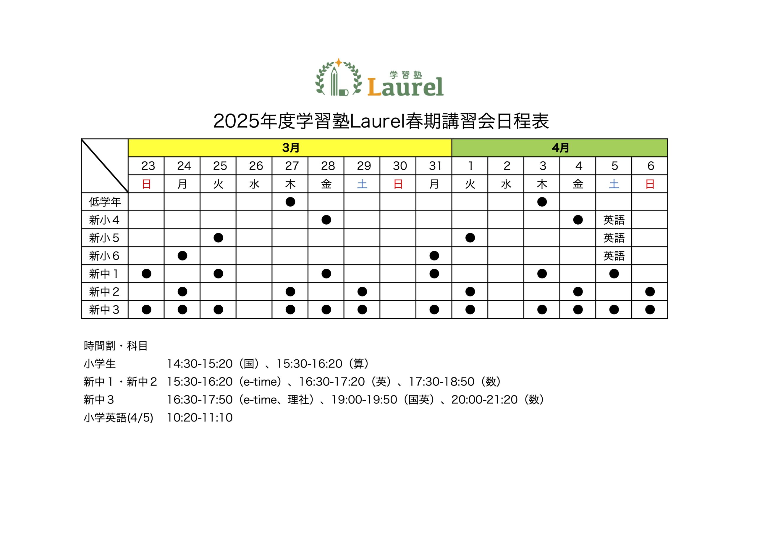 2025年度春期講習実施のお知らせ学習塾ローレルでは春休み期間中に春期講習を実施いたします。今年度からはe-timeも加わり講習の内容もさらにパワーアップしました。まだまだ新年度からの生徒を募集しております。お問い合わせにつきましてはこちらもしくはLINEからご連絡ください!