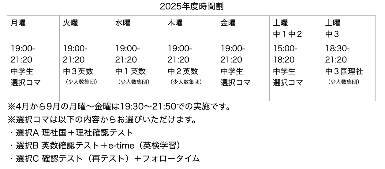 週に1回〜の集団指導とは別に、週2日〜の個別指導の時間を設けています。個別指導の時間では英数の授業内でわからなかったところのフォロー、理科・社会・国語、英検の学習を行なっていきます。個別指導は最大週3コマまで選択が可能です。料金に変動はありません。